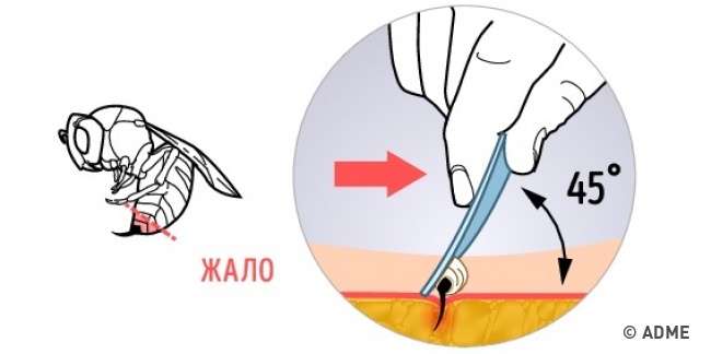Жало залишають тільки бджоли. Тому якщо вас укусила оса, не намагайтеся знайти жало: колупаючи місце укусу, ви занесете інфекцію. Щоб вийняти жало, використовуйте звичайну пластикову карту: поставте її під кутом 45° перед жалом і, трохи натиснувши на шкіру, проведіть з місця укусу. Потім обробіть ранку будь-яким антисептиком.