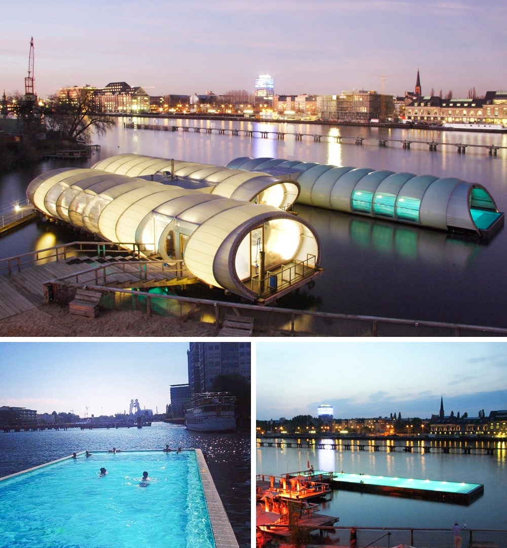 Плаваючий басейн Badeschiff дозволяє жителям Берліна відпочивати на березі річки Шпрее і купатися. Сама річка для цього занадто брудна. Басейн переобладнали із старої баржі. Взимку на нього надягають знімний дах.