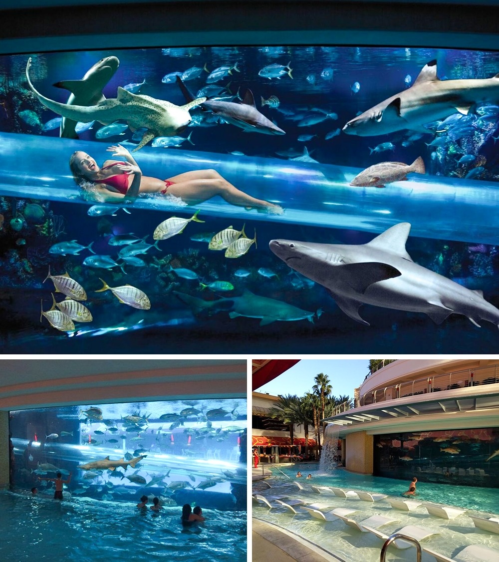 У басейні казино Golden Nugget в Лас-Вегасі можна поплавати поруч з 16 видами акул. Трирівнева гірка проходить через величезний акваріум з цими хижаками. Будівництво басейну обійшлося в $ 30 млн.