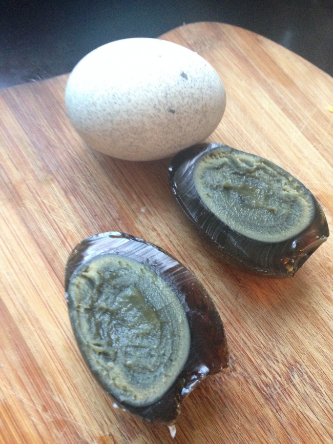 - Мабуть, самим екзотичним з точки зору зовнішнього вигляду можна вважати пі данину — «столітнє яйце». Яйця заквашуються у вапна (час закваски від — 15-20 днів до декількох місяців). Білок готового яйця набуває прозорий коричневий колір, а жовток стає чорним. Багато іноземців вважають «столітнє яйце» найогиднішим стравою китайської кухні, можливо, з-за легкого запаху аміаку. Але я особисто пі данину обожнюю, особливо змішане з легким тофу, заправлене соєвим соусом, кунжутним маслом і часником.