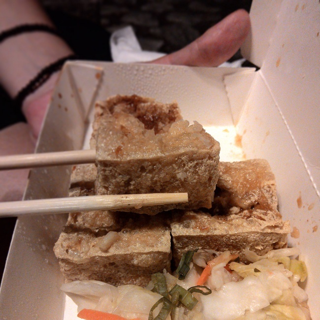 - Єдине блюдо, яким я поки зовсім не перейнялася, — це тухлий тофу — чоу доуфу. Саме так він і називається по-китайськи, і вірте мені, тухлим він називається не дарма. Сказати, що він смердить, — не сказати нічого. Сильний неприємний запах ви відчуєте задовго до того, як побачите лоток з цим «делікатесом». Причому в залежності від провінції інтенсивність запаху варіюється. Самий смердючий тофу мені зустрівся в місті Шаосинь, що розташований в провінції Чженьцзянь. Спробувати його я ризикнула лише після двох з половиною років життя в Китаї і, м'яко кажучи, не була вражена. Але особисто знаю людей, які люблять смердючий тофу не менш ніжно, ніж багато європейців смердючі французькі сири.