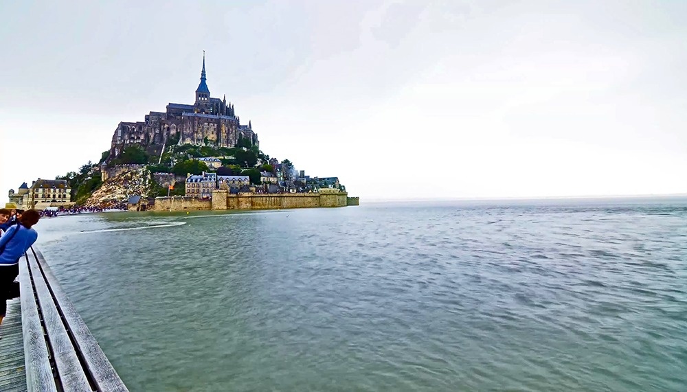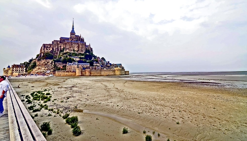 Величезний старовинний замок Мон-Сен-Мішель (Mont Saint Michel) збудований на скелястому острові, на який можна потрапити тільки під час відливу. В інший час ведуча до нього дорога, як і частина суші, затоплена.
