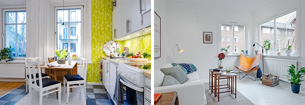 Ну і звичайно ж, всьому світу відомий шведський інтер'єр. Ось кімнати в типово скандинавському стилі: білі стіни, біла меблі, яскраві акценти в оформленні, величезні вікна і відсутність штор. Детальніше дивіться тут.