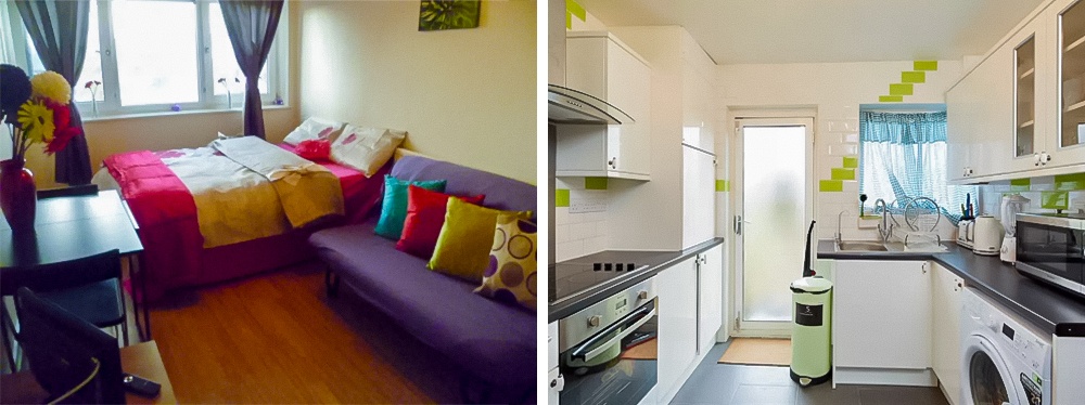 Єдина кімната квартири служить усім: і спальнею, і вітальнею, і їдальнею. В куті можна побачити холодильник. А якщо перелізти через ліжко, можна потрапити на балкон. Кімната світла і добре освітлена, що візуально збільшує простір.