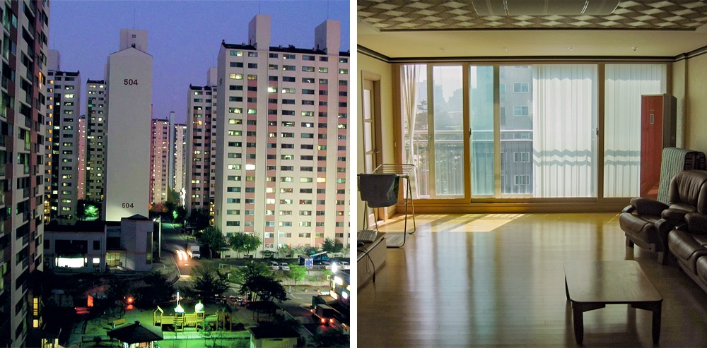 80 % корейців живуть в однотипних панельних багатоповерхівках — «апатах» (від англ. apartment). Зауважте, як зручно написаний номер будинку — на самому верху і величезними цифрами, щоб було видно здалеку.