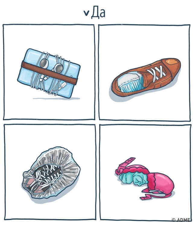 - Якщо пару взуття скласти в одноразову шапочку для ванної, то черевики не заплямлять інші речі.