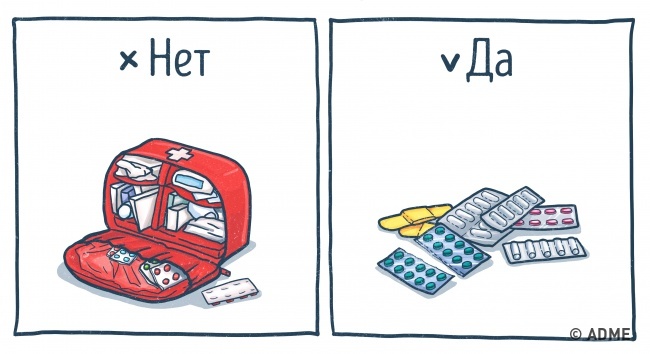 Всю домашню аптечку не намагаємося втиснути у валізу. Беремо по одному блістеру кожного необхідного ліки. Цього буде достатньо на випадок, якщо раптом щось десь прихопить.