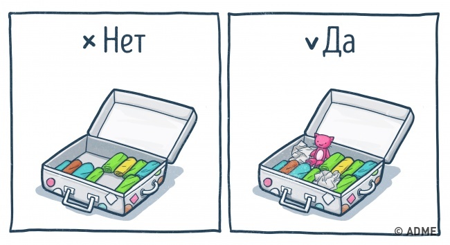Навіть якщо хочеться залишити місце для відпускних сувенірів, не потрібно між речами залишати пустот, інакше вони сильно помнуться і скомкаются.