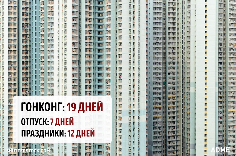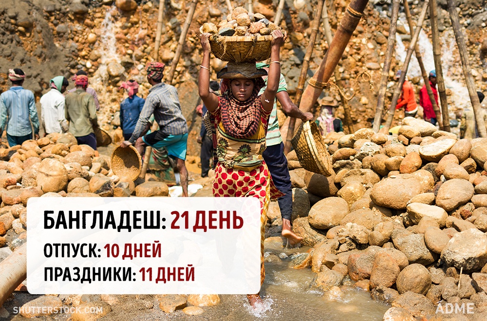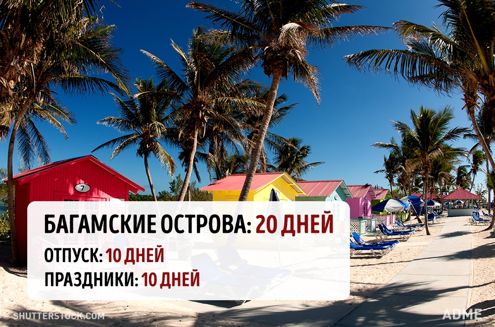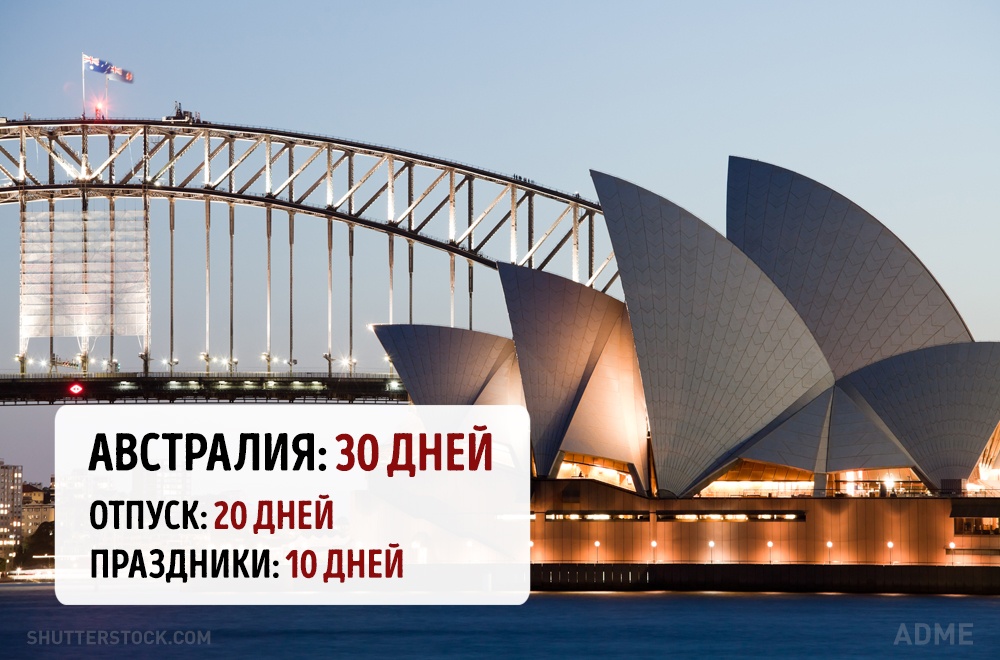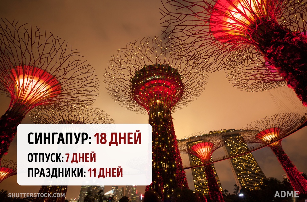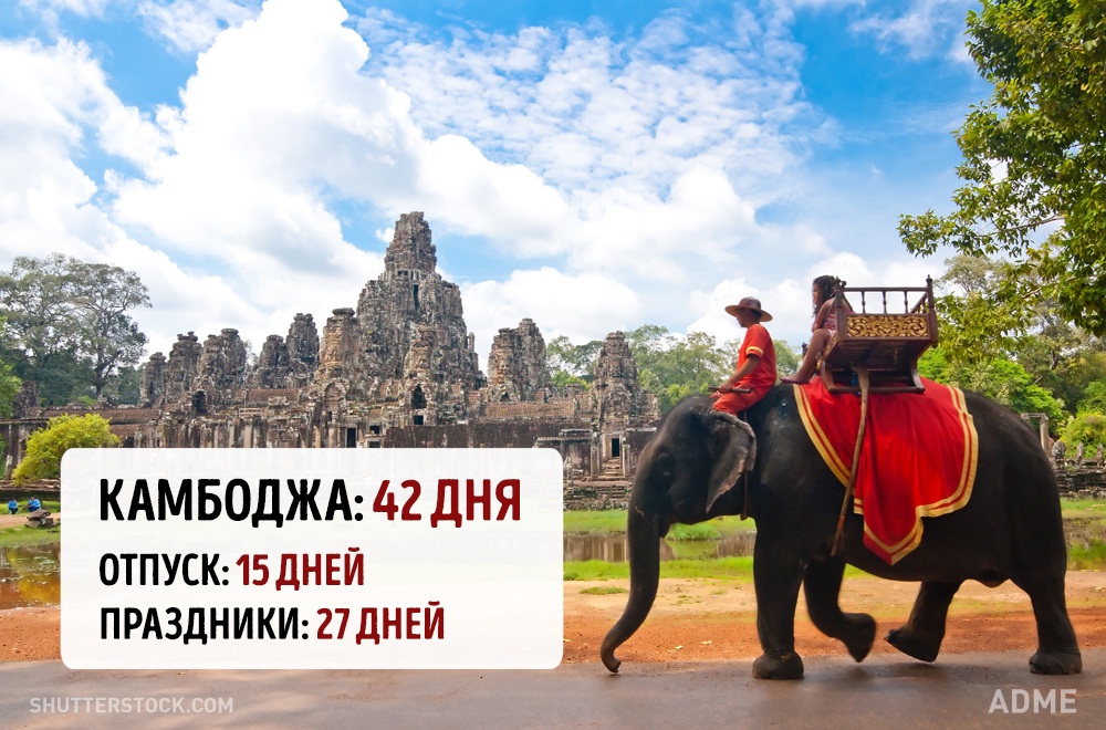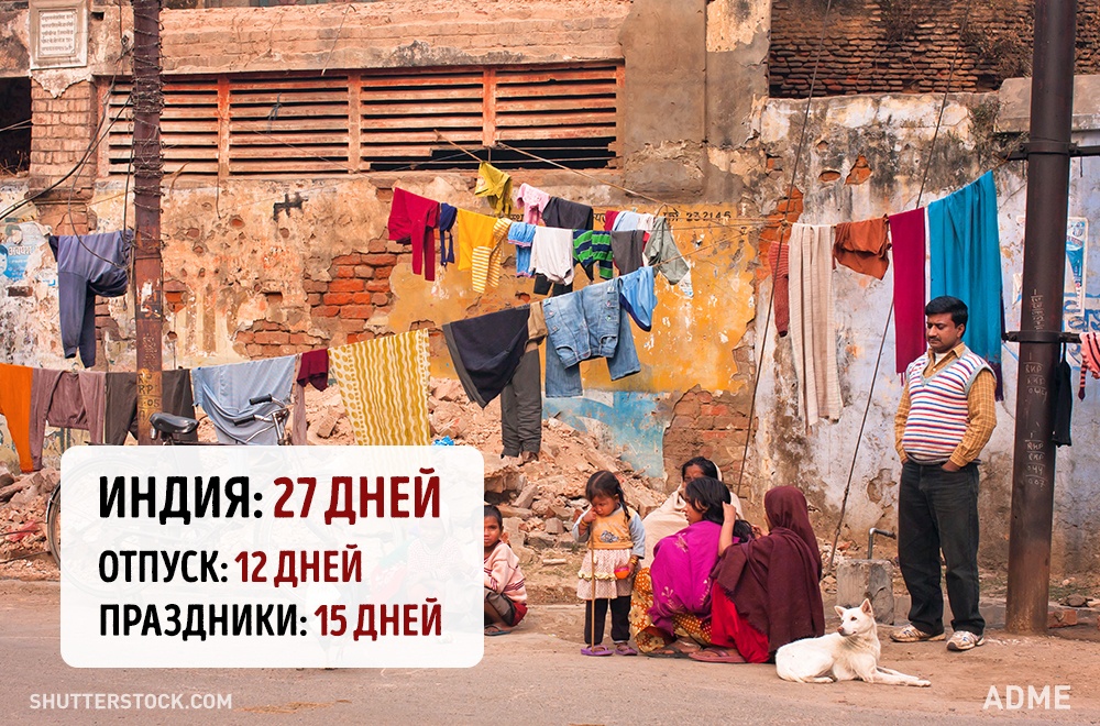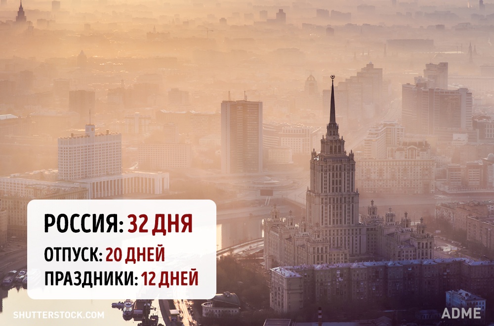 Social.org.ua задався питанням, а скільки днів відпочивають від роботи в інших країнах? При підрахунку ми враховували мінімальний відпустку без урахування вихідних і лише оплачувані державою свята. Варто відзначити, що в кожній країні є свої нюанси. Наприклад, в США відсутній законодавство у сфері відпусток, все залежить від правил всередині кожної окремої компанії. А в країнах Азії брати відпустку повністю взагалі вважається поганим тоном, тому відпочивають вони значно менше, ніж дозволено офіційно.