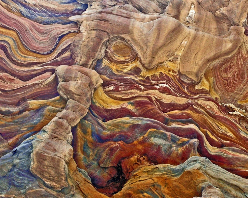 Червоний, рожевий, жовтий, сірий, фіолетовий і білий кольори чергуються між собою і створюють химерний візерунок на камені.