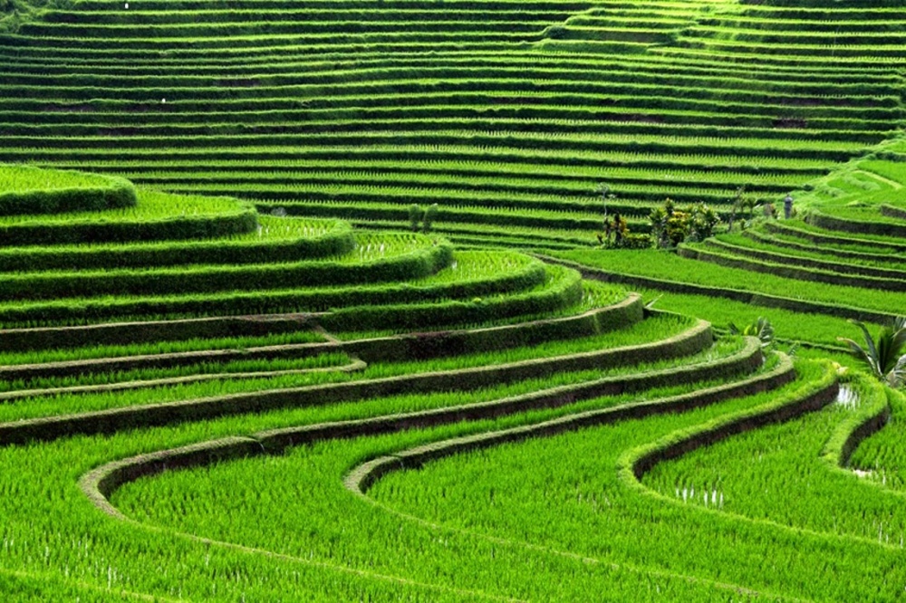 Рисові тераси на Балі в Індонезії, вражають своєю мальовничістю. Здавалося б, прості паростки рису, але як же художньо посаджено. Не дарма рисові поля і тераси на цьому острові залучають художників і збирають туристів.