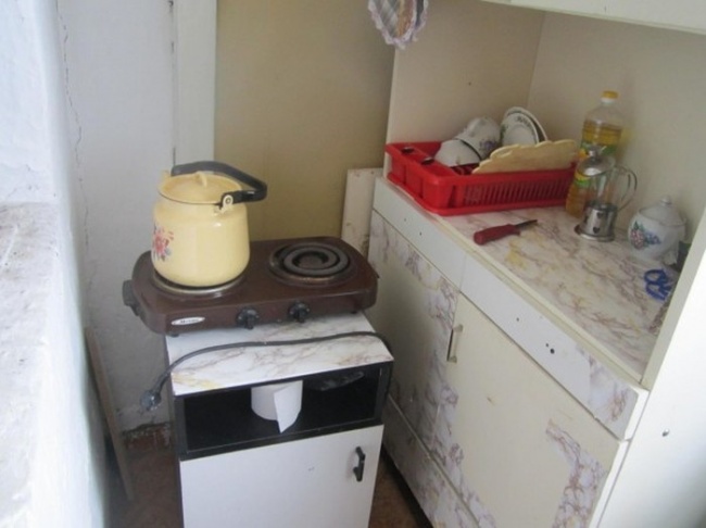 Ось за пічкою моя «кухня». Тут у мене плитка, шафа з посудом і дещо-якими продуктами.