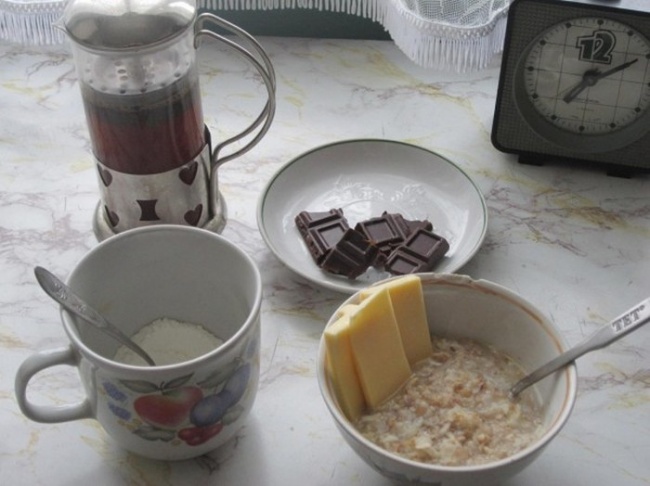 Сніданок мій, вважаю, прекрасний. У цьому місці взагалі починаєш цінувати якісь прості речі, наделяешь красою найхитріше. У чашці не цукор, а сухе молоко. У каші сир. Його я теж купила в місті по приїзді. В блюдце скибочки темного шоколаду з шматочками апельсина. Смакую вранці.