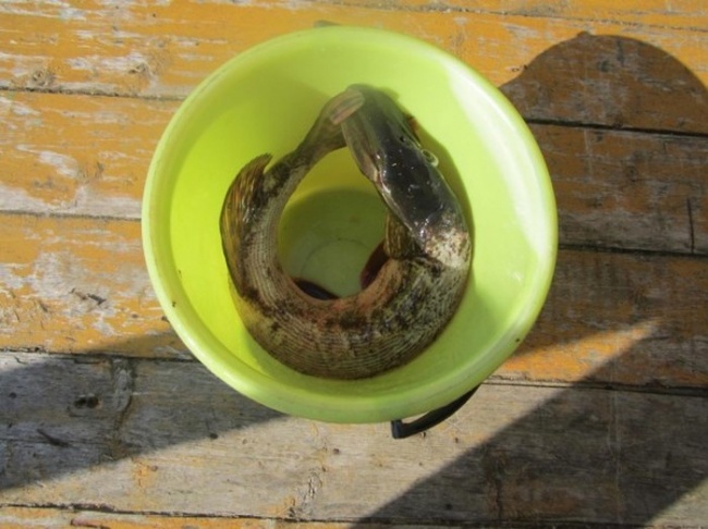 Закінчивши всі справи, повертаюся на березі річки. На своєму ганку виявляю ось такий сюрприз. З відерця мені підморгує щука. Вже почищена!
