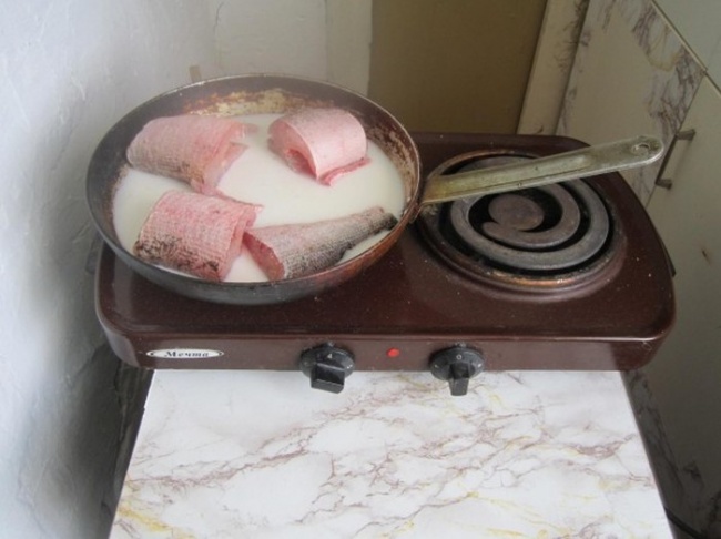 Неабияк замерзнувши на вулиці, я вирішила, що можна перекусити. Відразу беруся за приготування. Тушу в молоці. Все гранично просто. Посуду тут практично немає. Сковорода жахлива, але вона єдина в господарстві.