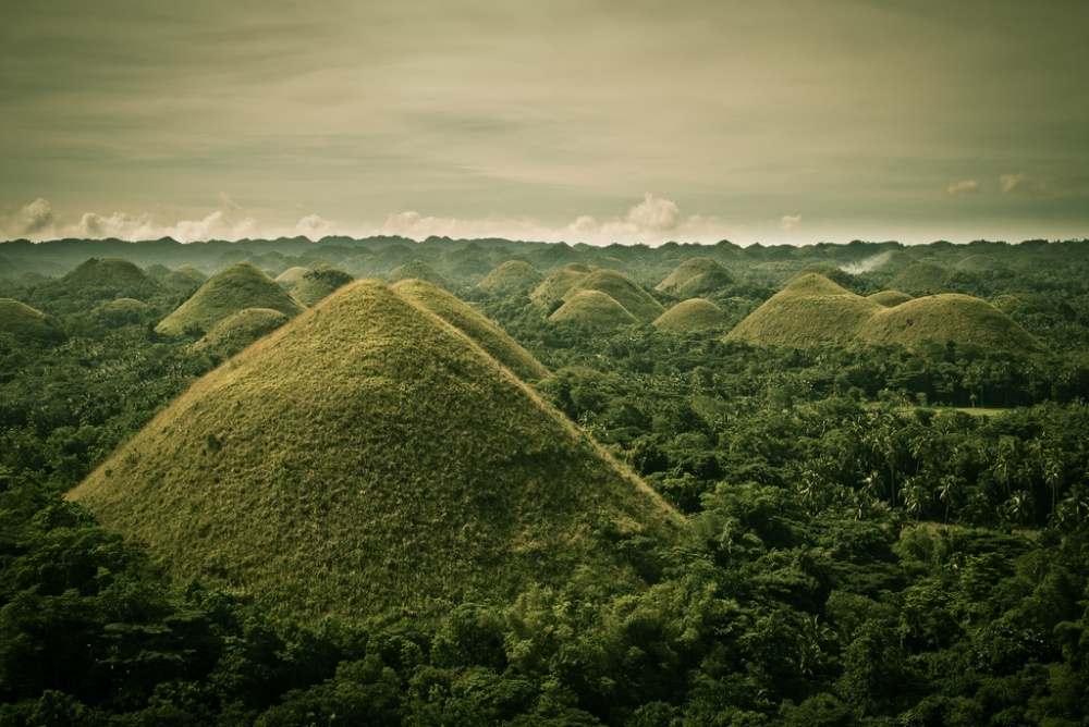 Унікальність їх полягає в тому, що вони мають правильну конусну форму з великим кутом схилів. Свою назву пагорби отримали з-за трави, яка, вигорить на сонці в сухий сезон, набуває коричневий колір і сильно виділяється на тлі яскравої зелені навколишніх лісів. Це "шоколадне" чудо світу.