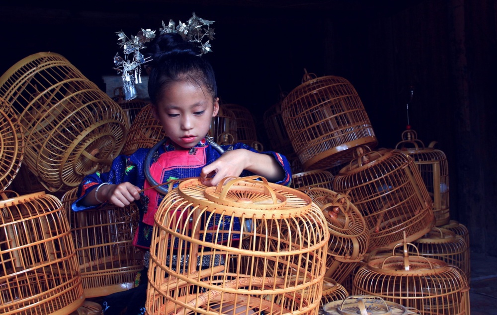 Дівчинка, чия сім'я займається виготовленням пташиних кліток, позує в національному костюмі.