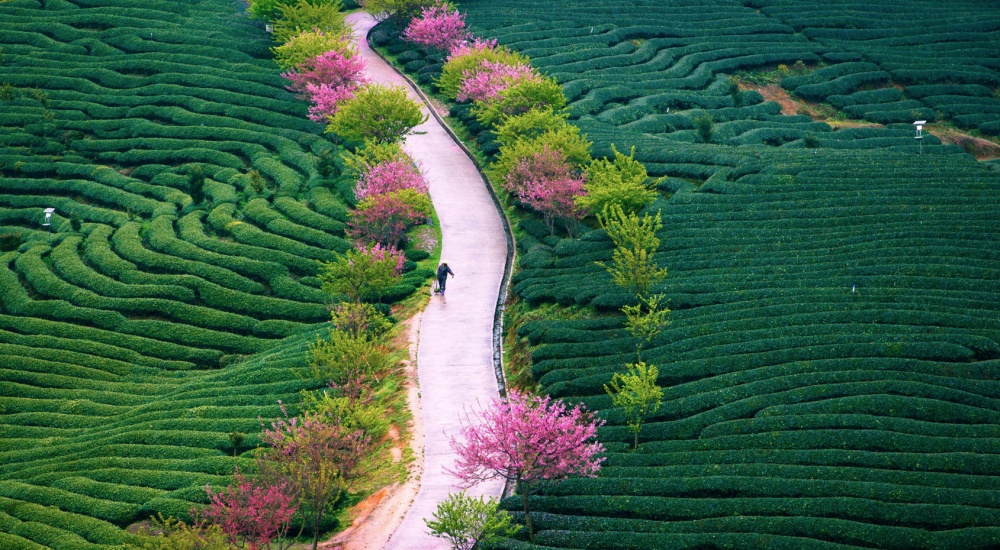 Отцветающие вишні і чайні плантації в провінції Фуцзянь.