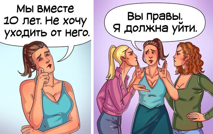 Приклад з життя. Чоловік зрадив дружині, вони разом 10 років. Жінка приймає рішення пробачити чоловіка, а після зустрічається з подружками, які переконують її кинути чоловіка. І жінка зважується на розлучення.
