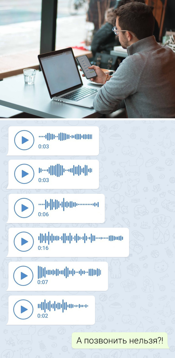 Іноді бувають ситуації, коли голосові повідомлення більш доречні, ніж текстові, — наприклад, коли важливо передати інтонацію. Крім того, варто враховувати, що кількість телефонних дзвінків стрімко скорочується з кожним роком. 25 % британців, які володіють смартфонами, не використовують їх для дзвінків. Це пояснюється боязню телефонних розмов, яка властива миллениалам. Так що не судіть занадто суворо.
