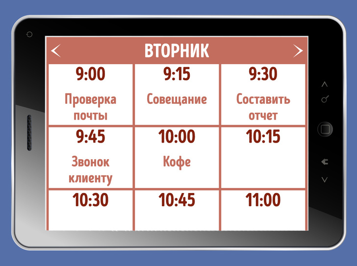 - Вони ніколи не складають список справ на день. Виявляється, що лише 41 % справ зі списку виконується насправді, а невиконані завдання залишаються висіти тяжким вантажем, викликають безсоння і призводять до стресу. Продуктивні люди поміщають всі завдання в 15-хвилинні блоки в електронному календарі, а потім чітко дотримуються цього розкладом.