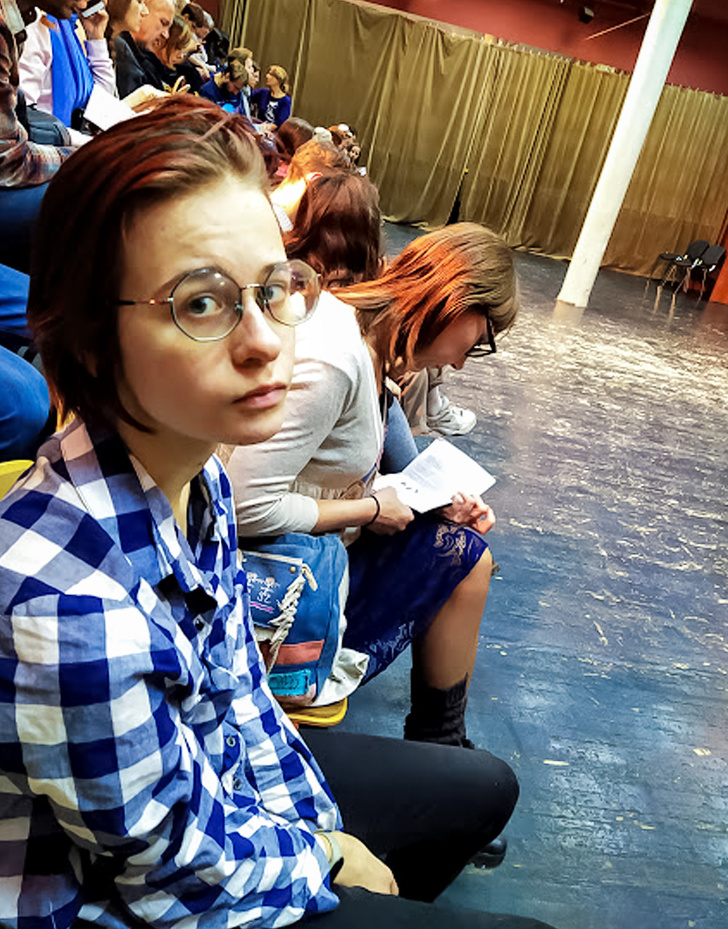 Щоб не розслаблятися дарма, почала я свій експеримент з квесту підвищеної складності. А саме вирушила на майстер-клас по сценічному розкріпаченню, сама тема якого змушувала мене нервово тремтіти. Втім, на місці я зрозуміла, що справи йдуть ще гірше, ніж здавалося: зал був забитий битком. Причому близько половини глядачів вирішили у всьому цьому брати участь і захоплено спостерігали, як інші слідом за провідною розмахують руками і проспівують голосні, знімаючи внутрішні затискачі.