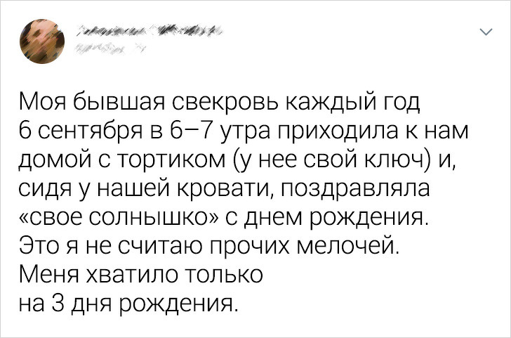 А ще платили їй за півквартири, хоча я з сином була прописана у батьків. Ну і інше ще було... Дико мені все це було, але користь була: я побачила, який ніколи не можна бути! Зараз всі мої невістки — мої подружки і я їх люблю. © Троянда Цвєткова / facebook