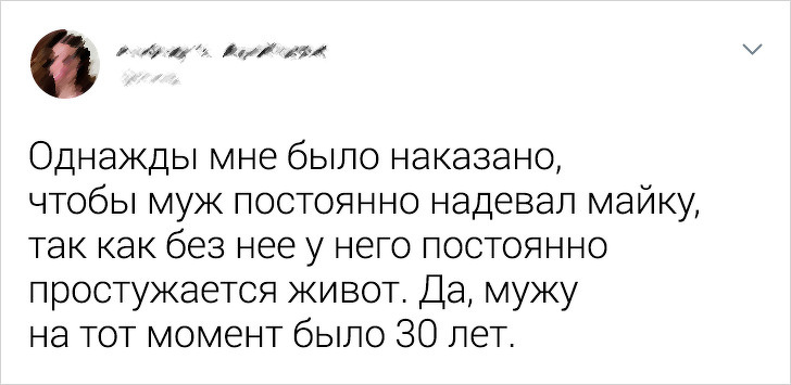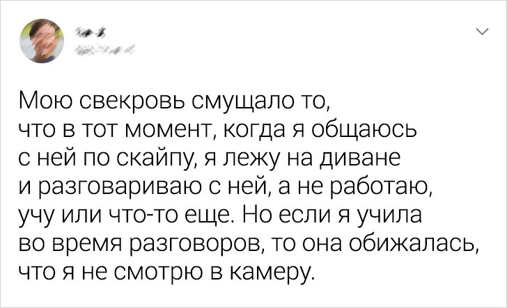 Коли ми з чоловіком одружилися, я ніяк не могла звикнути, що моя свекруха дзвонила ввечері і перевіряла, чи вдома ми після 9 вечора. А то не дай бог її син бовтається по вулиці (бандити кругом!). А йому на той момент було 35. Ну ми гуляли до 9, приходили додому, син отзванивался мамі, та лягала спати, а ми спокійно далі йшли гуляти. Мобільників тоді ще не було і доводилося йти додому. © Ольга Сердюк / facebook