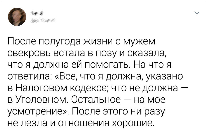 Ага, звичайно... А потім після тривалого втручання у нашу з чоловіком життя я їй взагалі заявила, що в моїй новій квартирі ноги її не буде. Але це вже інша історія... © natatar / pikabu