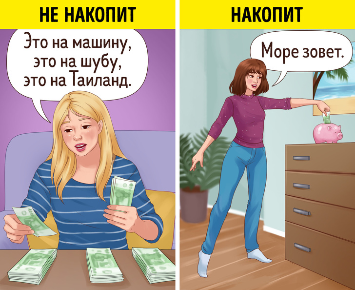 Заведіть скарбничку для готівки — необов'язково класичну свинку, головне, щоб вона вам подобалася, і тоді процес буде в задоволення. Якщо йдеться про кошти, що зберігаються на карті, в кінці тижня переводите залишки на поповнюваний внесок.