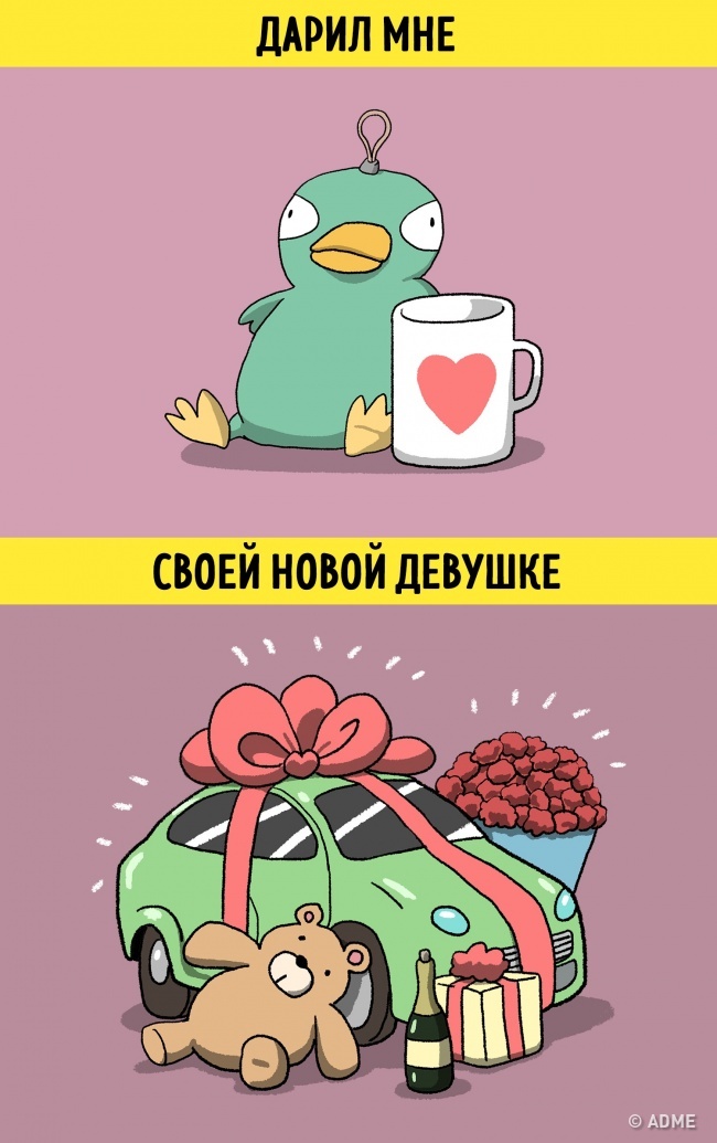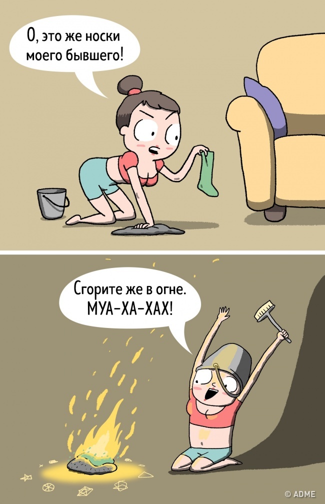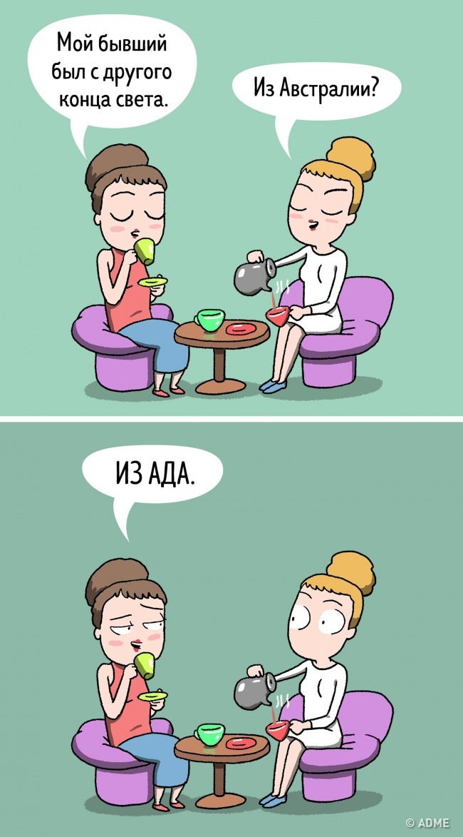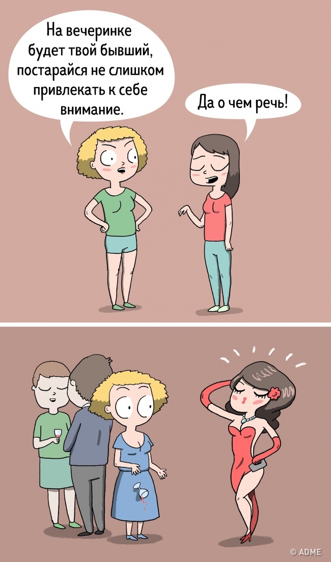 Напевно, у всіх нас були невдалі стосунки, які ні-ні та й помянешь незлим тихим словом. А іноді наче й забув про них, живеш собі щасливо, а тут бац — привіт з минулого, давно не бачилися. А ти з немитою головою і в треніках. І як після цього не вірити в закони підлості? Про цих самих законах і забавні збіги ми й вирішили розповісти в наших коміксах.