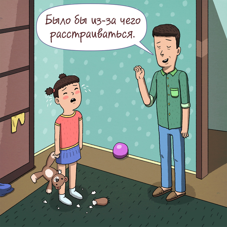 Коли ми говоримо таку фразу, нам здається, що ми допомагаємо дитині, але насправді тільки шкодимо. Навіть якщо нам здається, що привід для сліз виїденого яйця не коштує, це не означає, що малюк так само сприймає свою трагедію.