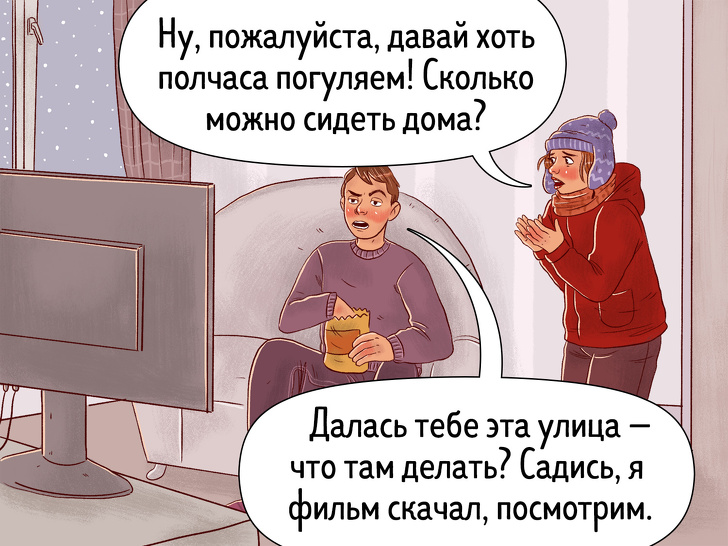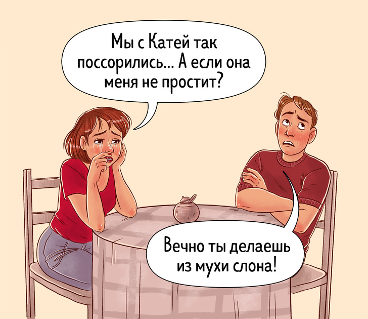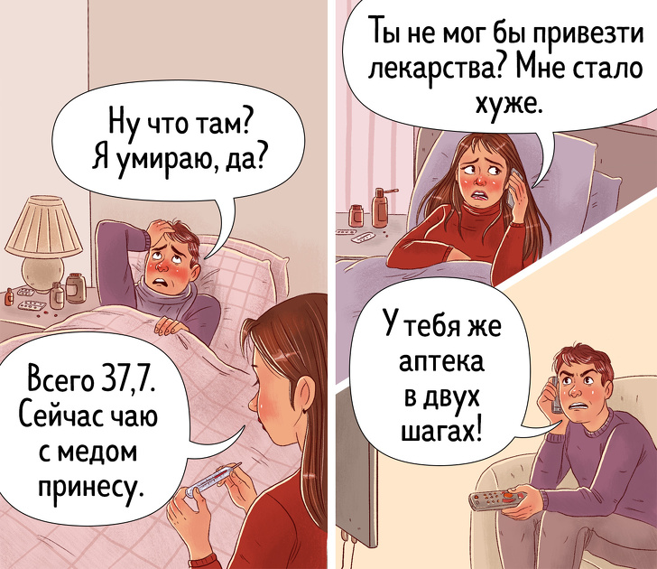 Ви повідомляєте новому другу про несправність крана, а він співчутливо знизує плечима, цілує вас в лоб і йде пити пиво з друзями. Ваш приятель поскаржився, що його дівчина відмовилася допомогти в пошуку подарунка мамі, пославшись на запис в манікюрний салон. Але якщо допомога буде потрібна вашій половинці, будьте впевнені, що вас обов'язково привернуть до вирішення проблем і дико образяться, якщо ви відмовитеся допомагати.