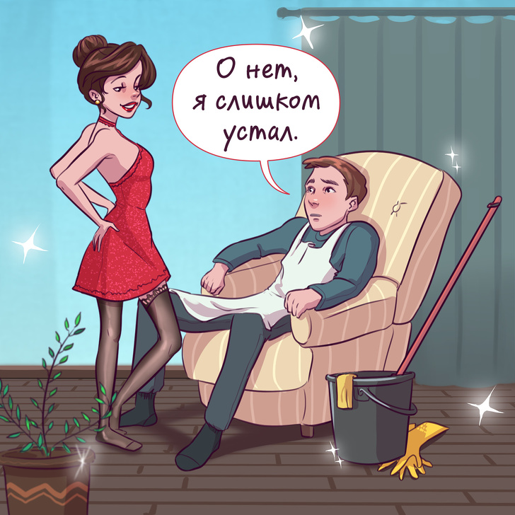 Кумедний приклад з життя: «В однієї дами чоловік вважав, що домашні справи — це обов'язок жінок. Але одного разу увечері вона повернулася додому і виявила, що все сяє чистотою. Виявилося, чоловік прочитав у журналі статтю про те, що дружина буде більш схильна до любовним іграм, якщо не втомиться від домашніх справ. І це особливо важливо, якщо жінка працює. Дружина з гордістю розповіла про це на роботі. „Ну і як, любовні ігри були?“ — Ні, він дуже втомився“». © JurassicMom / Pikabu