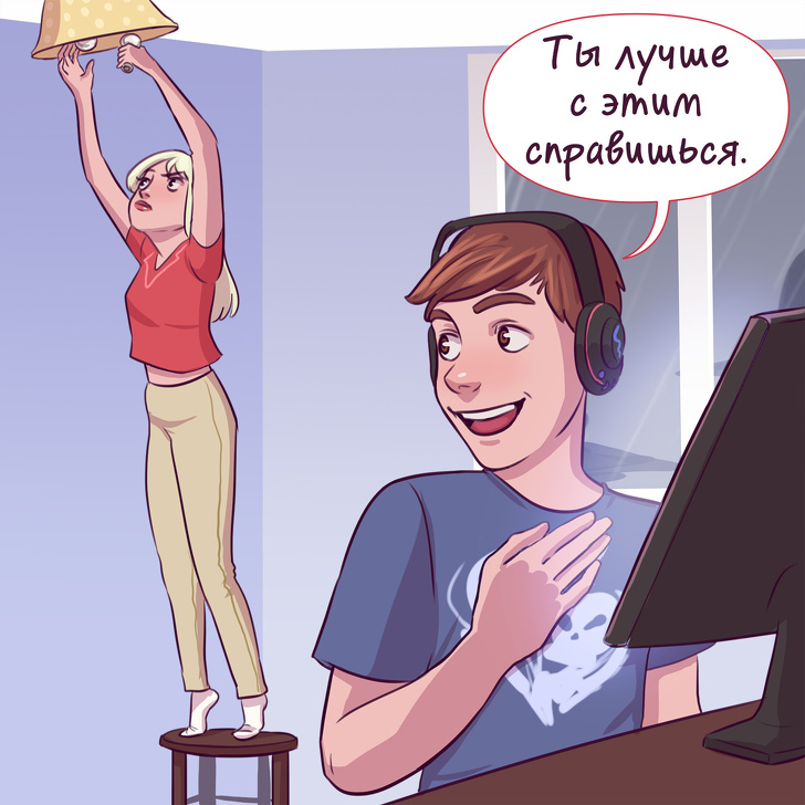 Щоб не говорити прямо «Я не хочу і вважаю дане заняття тужно і принизливим для себе», чоловік може сказати «Це легко», «Ти сама краща (не гірше) мене з впораєшся». У розряд «дуже складних» для нього, але «легких» для неї справ може потрапити не тільки приготування обіду або оплата комунальних рахунків, а також прибирання («А раптом я щось зіпсую») і похід в магазин («Ой, я знову куплю що-небудь не те»).