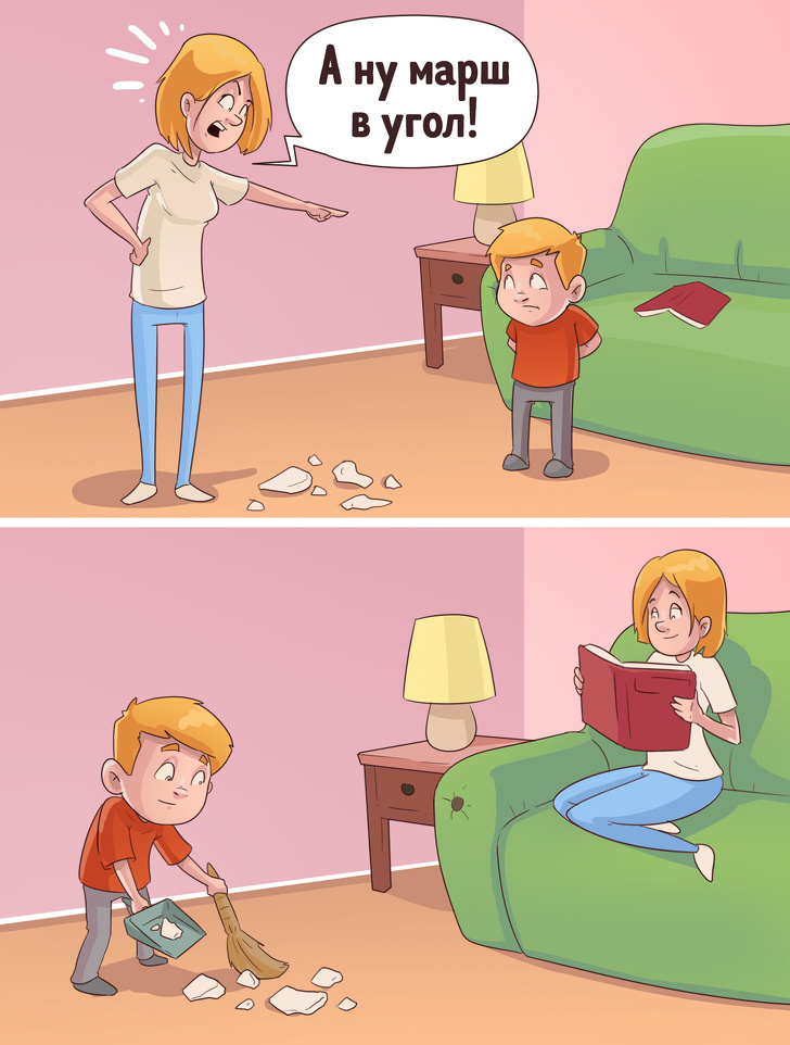 Замість того, щоб лаяти дитину за кожну провину, дозвольте йому самому виправити ситуацію. Якщо дитина розбила тарілку, дайте йому віник, измазал підлогу фарбою — вручите ганчірку. По-перше, так ви зрозуміліше поясніть, чому треба дбайливіше ставитися до речей. По-друге, навчіть дитину відповідальності.