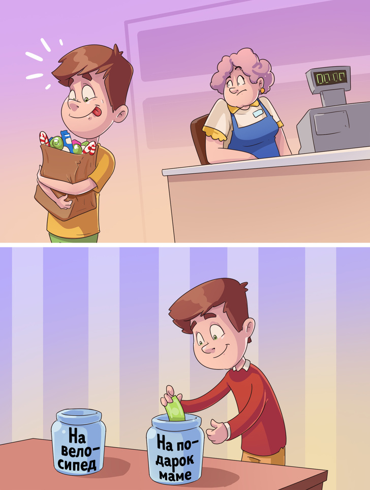 Так само, як дорослі відкладають гроші на відпустку, придбання машини або навчання в інституті, дитина має навчитися збирати гроші на свої потреби. Встановіть разом з ним спеціальні баночки, кожну для своєї мети. Наприклад, це може бути купівля дорогої іграшки або нового велосипеда.