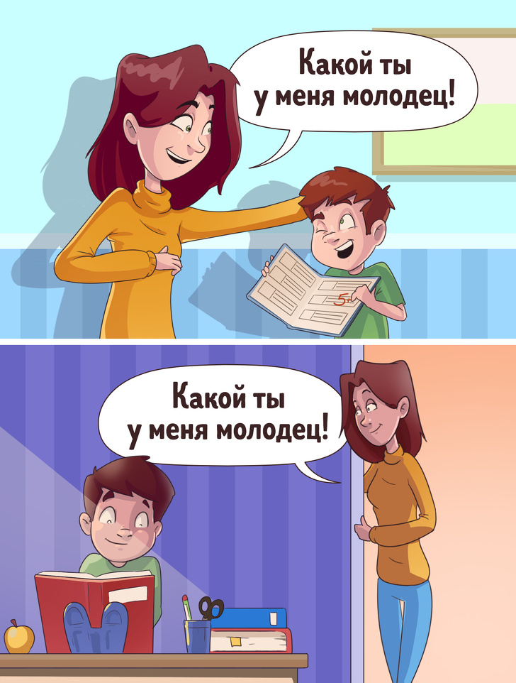 Хваліть дитину не тільки досягнення, але і за докладені зусилля. Наприклад, замість того, щоб похвалити за гарну оцінку на контрольній, похваліть за старанну підготовку до неї. Хваліть не за перемогу на змаганні, а за численні тренування перед ним.