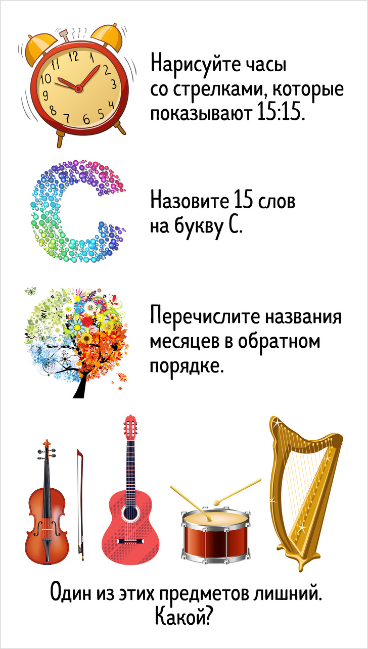 Покажіть літній людині цей тест і дайте йому 15 хвилин на виконання. Якщо досліджуваний робить впевнено тільки половину завдань, то, можливо, деякі когнітивні порушення у нього вже є. В цьому випадку потрібно швидше відвідати лікаря.