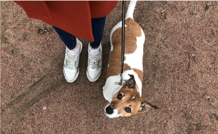 «Коли вже додому?» — читається в очах собаки, яка усвідомила, що замість запланованих 20 хвилин гуляє вже годину.