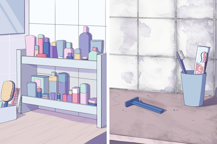 За зовнішнім виглядом ванної кімнати можна сказати, наскільки людина піклується не тільки про своє тіло, але й про психологічний комфорт. Чиста ванна — показник того, що нею користуються регулярно. Гелі для душа, різноманітні масла, якісна зубна паста, креми для тіла та обличчя — всі ці речі говорять про те, що людина дбає про себе. Якщо ж у ванній кімнаті зберігається тільки бритва з присохлої до неї піною і старий шматок мила, не факт, що у її господаря депресія. Однак, швидше за все, у нього високий рівень стресу і навряд чи він сильно стурбований своїм зовнішнім виглядом.