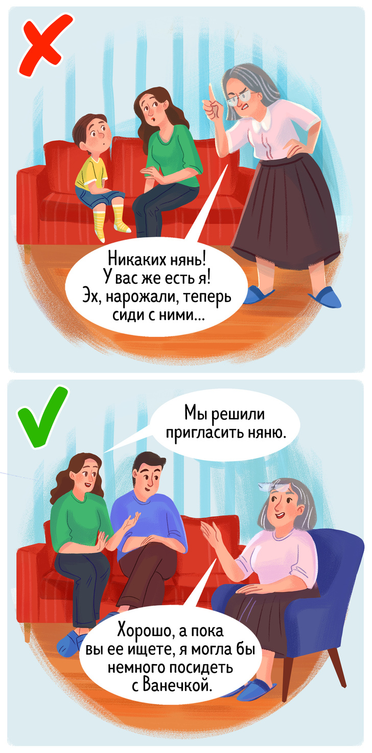 - Яку участь у вихованні повинні приймати бабусі і дідусі? Часто голос бабусь і дідусів виявляється чи не важливіше голоси педіатра. Непогано, якщо бабуся висловлює свої міркування чи допомагає за своїм бажанням. Погано, коли вона приймає відповідальні рішення щодо дитини.