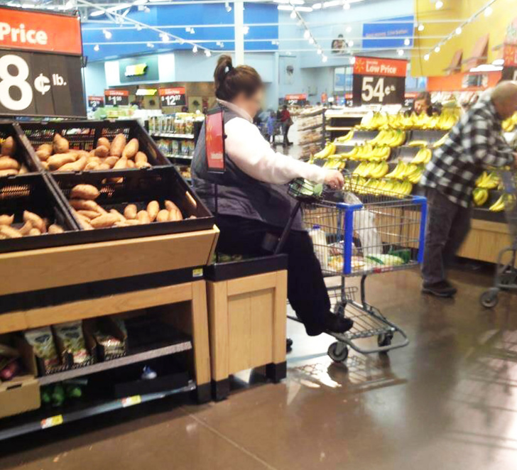 16. Жінка сіла відпочити прямо на прилавок з яблуками