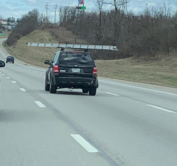 15. Хлопець перевозить сходи, закріпивши її поперек машини