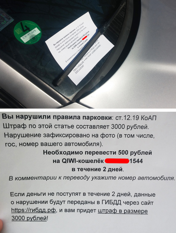 Ще один оригінальний спосіб вимагання грошей зафіксований в Санкт-Петербурзі. Шахрай знаходить жертву, яка припаркувалася, порушивши ПДР, кладе під двірник записку з вимогою протягом 2 днів перерахувати 490 рублів на QIWI-гаманець. В іншому випадку він обіцяє направити «фотодокази» в ГИБДД. І в цьому випадку автомобілісту доведеться сплатити штраф до 3 000 рублів