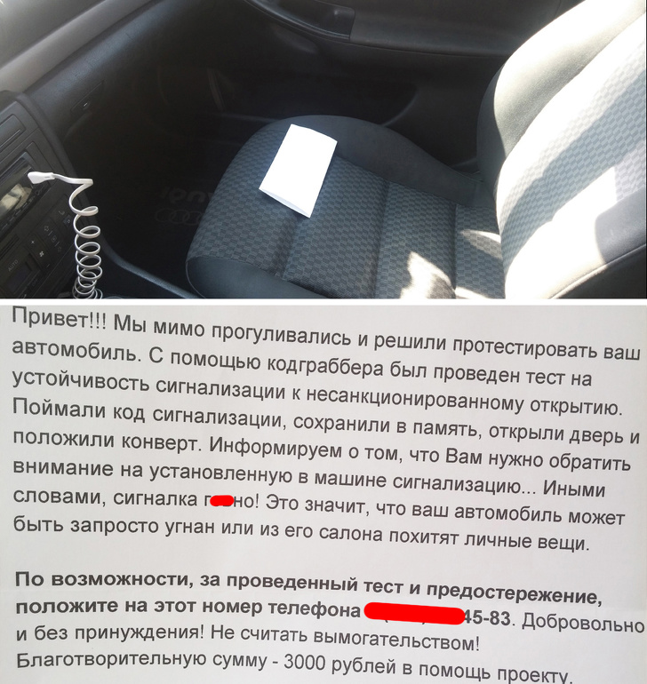 Уявіть, що ви залишили машину на ніч біля будинку, а вранці виявили всередині неї запечатаний конверт з листом. А автомобіль був замкнений, і ніякого конверта в ньому не було! Стає очевидно, що хтось зміг проникнути у машину. У листі йдеться: «...Сигналізація була протестована на розтин, і тест був провалений. Віддячите нас фінансово за перевірку вашої захисної системи, і ми надішлемо вам АВТОРСЬКІ РЕКОМЕНДАЦІЇ, як покращити охоронну систему вашого залізного друга». Автовласники, стурбовані тим, що в їх автомобіль змогли проникнути, переводять гроші, очікуючи отримати «авторські поради». Але у відповідь, звичайно ж, нічого не приходить.