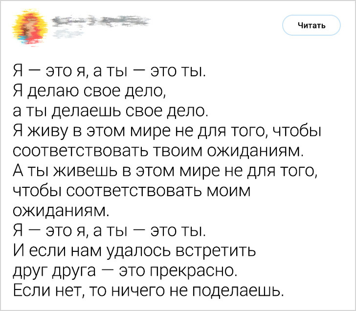 От дивні люди, чи не правда? Щастя — це ж так трудомістко, вимагає зусиль і дій. Роботи над собою. Куди простіше бути нещасним: лежиш на дивані, так жалієш себе. Але ні, гештальтисты вибирають бути щасливими.