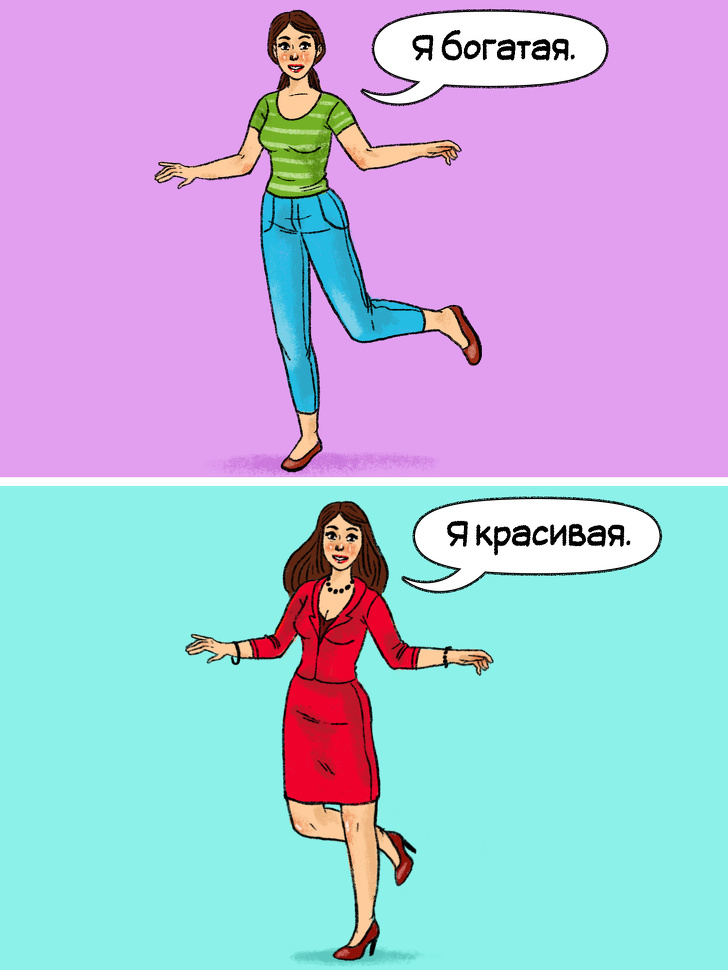 Візьміть аркуш паперу і напишіть свою мету. А потім — установки, які заважають вам її досягти. Після цього напишіть фразу, зворотний негативній установці, припустимо: «я сильна», «я красива», «я багата», «я успішна» і т. д. Потім попросіть близьку людину прошепотіти вам цю фразу на вухо і торкнутися вашого плеча.
