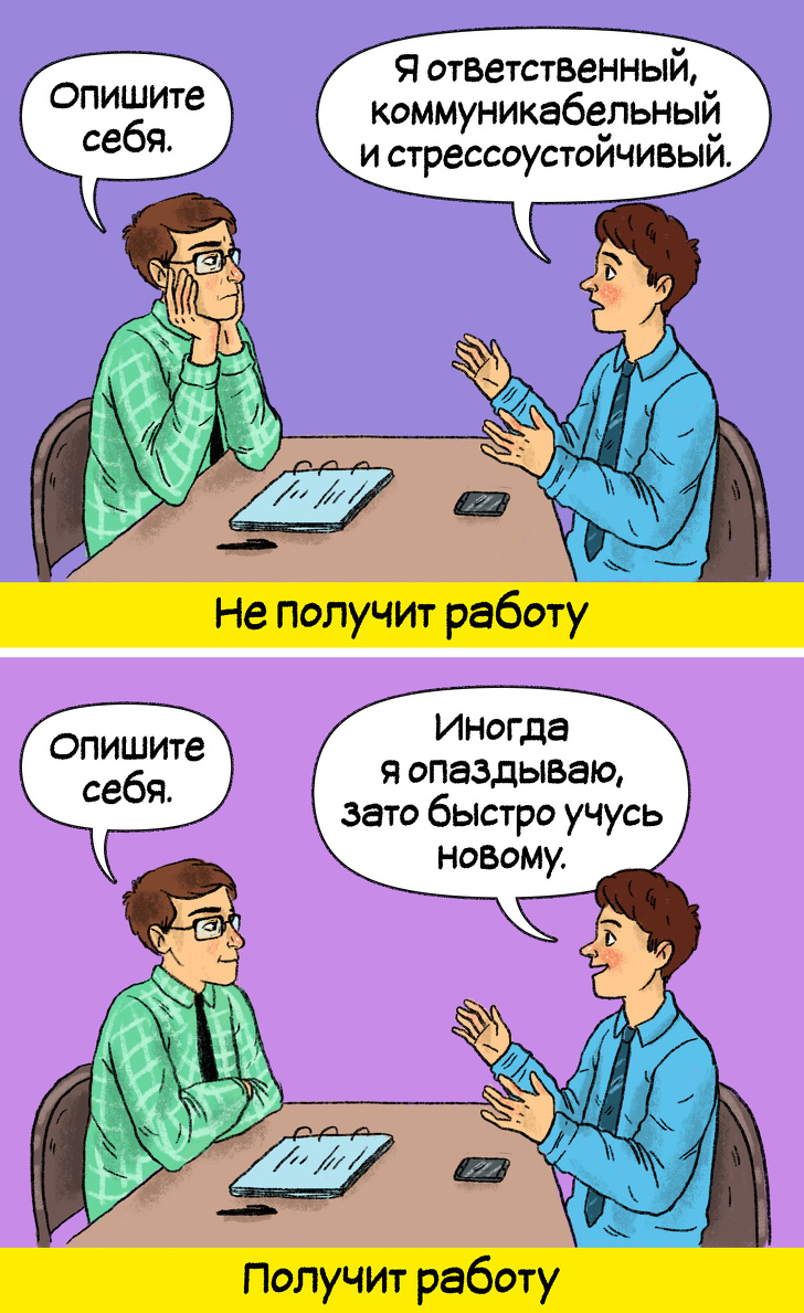 Коли ми йдемо на перше побачення або намагаємося справити враження на потенційного роботодавця, то прагнемо показати співрозмовнику тільки позитивні якості, змовчавши про недоліки. Це завідомо програшна тактика, адже навіть якщо вас оберуть, довго шифруватися ви не зможете і всіх своїх демонів рано чи пізно доведеться випустити. А натужні спроби показати себе самим-самим лише відштовхнуть від вас людей, адже ви будете грати лише роль.