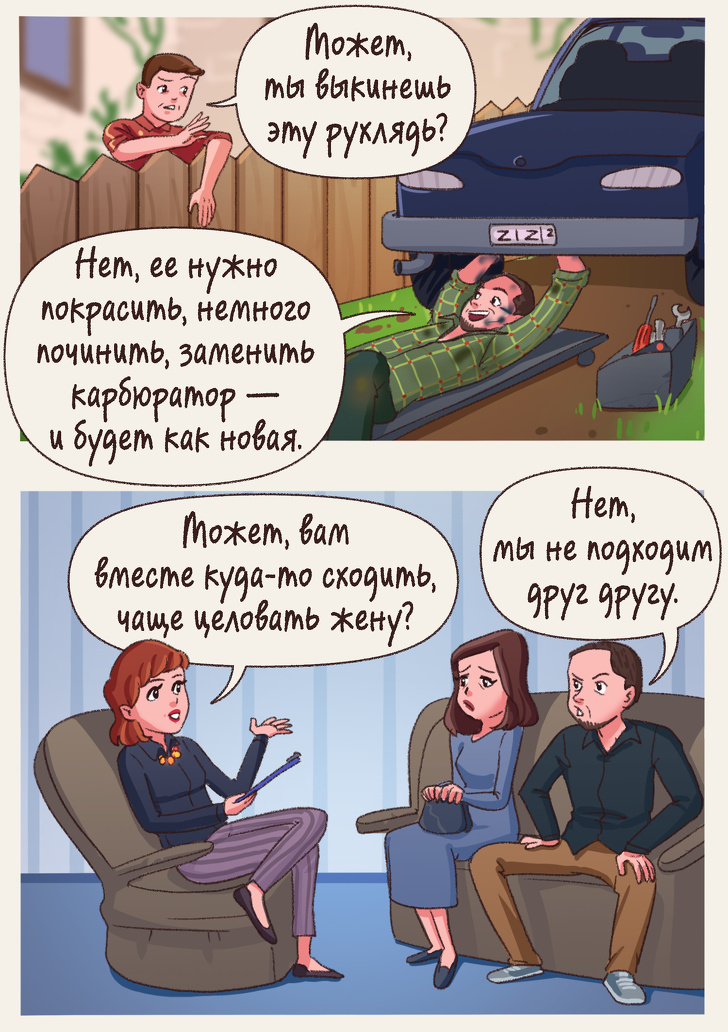 Думка про те, що ви з партнером не підходите один одному, найчастіше виникає у тих пар, які не працюють над своїми відносинами, не спілкуються і не цікавляться справами один одного. Вони можуть бути занадто зайняті дітьми або роботою. Але ж точно так само, як машина вимагає догляду і палива, відносини з партнером вимагають уміння відстоювати те, що для вас важливо, а також здатності миритися з недоліками коханої людини.